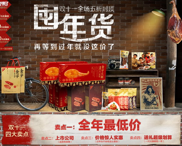 11月14日,在淘寶轟轟烈烈的雙十一活動三天之后,金字火腿的工作人員終于把最后一批打包好的活動商品搬到快遞公司的車輛上。與此同時,淘寶雙十一火腿類目排行榜出爐,金字火腿毫無懸念奪得銷售冠軍。