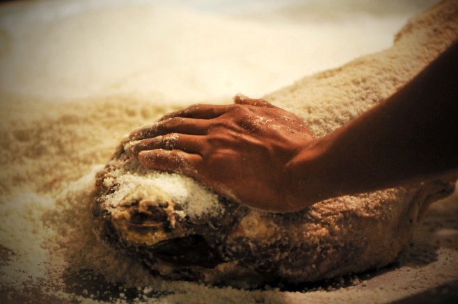 腌制火腿要使用大量的鹽,鹽并不是一次性倒入到火腿當(dāng)中的,而是要將鹽均勻地涂抹到肉腿上面。涂也不是一次性就能涂抹好,每條腿可能都要經(jīng)歷6—7次“美膚”和“按摩”的過程,最終表面結(jié)成白色的鹽霜,肌肉變得堅(jiān)硬緊實(shí)了才算可以了。第一次抹鹽叫做“上小鹽”,就是先將薄鹽抹在豬腿的表面,然后腌制一晚。第二次抹鹽叫做“上大鹽”,是在“上小鹽”的次日,這次要先將腌制出的血水用手?jǐn)D出,之后再均勻地涂上新的鹽。之后的上鹽均是在肉質(zhì)比較肥厚和筋骨相連的地方著重補(bǔ)鹽,時(shí)間則是在第7天、第13天、第27天。經(jīng)過這些次的鹽腌,整條豬腿均被食鹽腌透浸滿,腌的時(shí)候碼放也是有講究的,皮朝下肉朝上,最后一層則是皮朝上的。