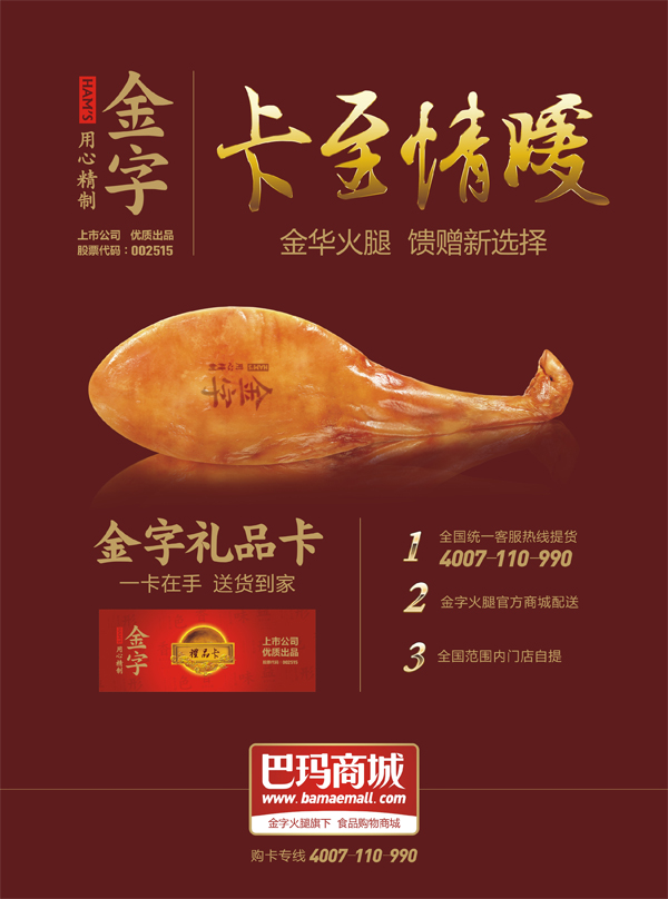 作為一家上市公司——金字火腿推出的禮品卡,禮品卡多年信譽(yù),廣受消費(fèi)者的真心歡迎,每年回頭客無數(shù),而更重要的是,金字每年把產(chǎn)品的品質(zhì)和備貨做到更好,禮品卡內(nèi)產(chǎn)品都是公司層層品質(zhì)歷練的熱銷產(chǎn)品,用火腿、臘肉、香腸這些實(shí)在心意,去感動(dòng)每一位朋友。如今,更是可以通過手機(jī)微信關(guān)注金字火腿,盡享中華美食同時(shí),與朋友分享禮品卡里所蘊(yùn)含的真情實(shí)意。