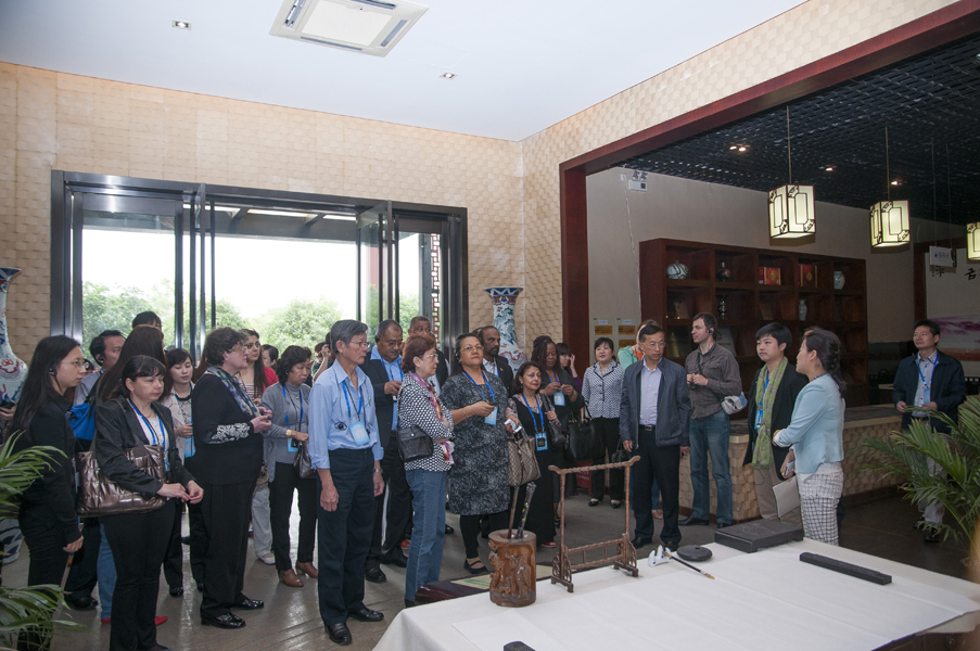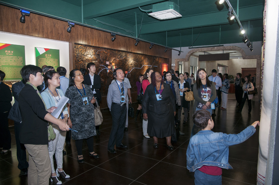 從一進(jìn)中國(guó)火腿博覽館的大門(mén)開(kāi)始,使節(jié)們就被眼前精美的浮雕所吸引。透過(guò)金字火腿吳月肖副總經(jīng)理有趣的解說(shuō)和翻譯的詳盡翻譯,50余人才搞明白:原來(lái)這就是著名的《百姓勞軍圖》,而使節(jié)中的一些“中國(guó)通”發(fā)現(xiàn)他們熟知岳飛的師傅宗澤,原來(lái)竟然是金華火腿的祖師爺,火腿原料金華兩頭烏如此有趣珍貴,就好比中國(guó)的熊貓。
